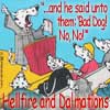 Description: Cartoon picture of a spotted dog at a pulpit preaching to other dogs and text "Hellfire and Dalmations"